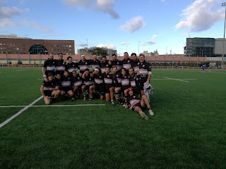 Qu’en dire ? Drancy non plus n’était pas au complet deux de leurs joueurs leur ayant fait défaut au dernier moment. Ils nous opposèrent une équipe composée de quelques vieux mais surtout beaucoup de jeunes. Dès qui n’ont pas oublié d’apprendre à courir. Qui visiblement s’entraînent ensemble. Et c’est « logiquement » qu’ils entamèrent ce match avec la main mise sur le ballon. Pendant les 15 premières minutes, nous savions bien qu’il y avait un ballon sur le terrain (ben oui, on ne fait pas du « air rugby ») mais nous n’en avons pas vu la couleur. Drancy jouait beaucoup avec ses avants, au ras, lancés. Beaucoup dans nos 40. Mais si sur quelques charges le mur se fissurait, la ligne Maginot vêtue de noir et rose ne cédait pas et se comportait avec vaillance. Et petit à petit, nous commencions par-ci par-là à entrapercevoir le truc ovale, dont la feinte convoitise n’est qu’un prétexte pour se rentrer allégrement dans la gueule. Et suite à un dégueuli Drancéen, bien aidé en cela par notre rude défense, Julien « golden foot » avait l’occasion d’en admirer enfin les coutures et de nous expédier chez eux par une belle touche. La suite, c’est nos avants qui se structurent bien, déplacent intelligemment le maul, et vont aplatir respectueusement le bel objet dans l’en-but.